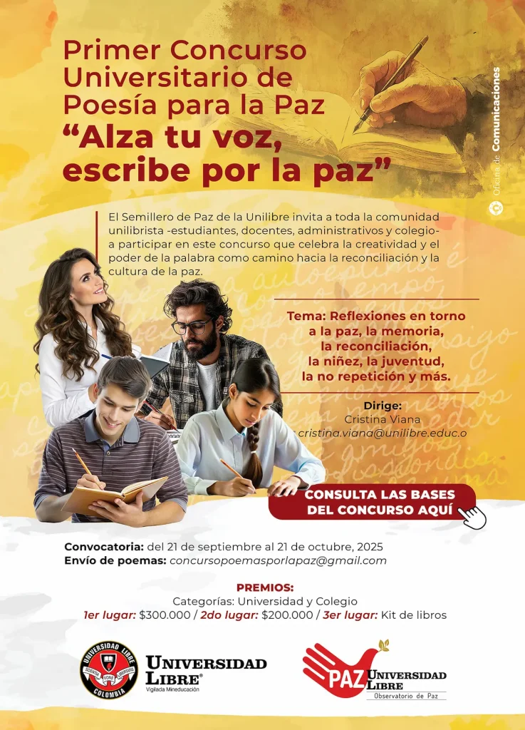 Este concurso invita a participar a toda la comunidad unilibrista: estudiantes, docentes, administrativos y jóvenes del Colegio de la Universidad Libre (grados 9°, 10° y 11°). Los participantes podrán presentar poemas inéditos que reflexionen sobre la paz desde múltiples perspectivas: memoria, no repetición, territorio, niñez, juventud, esperanza, reconciliación, entre otros.