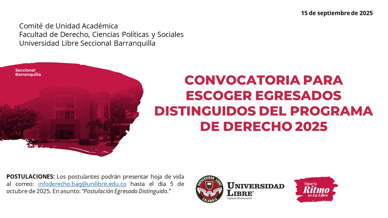 Teniendo en cuenta que en el mes de noviembre de 2025 se llevará a cabo el XIV Encuentro de Egresados de la Facultad de Derecho, Ciencias Políticas y Sociales de la Universidad Libre Seccional Barranquilla, y se apertura la recepción de hojas de vida del 15 de septiembre al 5 de octubre de 2025 para dar apertura a las postulaciones con el fin de elegir a los egresados distinguidos del programa de derecho, los cuales serán seleccionados por el Comité de Unidad Académica, según los parámetros de escogencia.