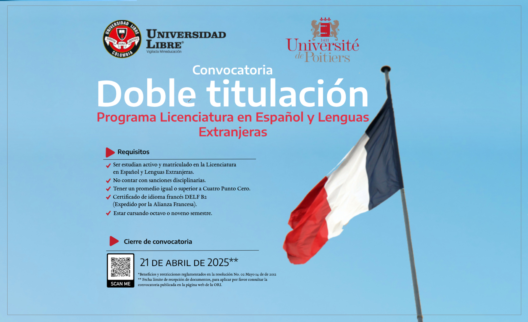 La Universidad Libre anuncia la apertura de la Convocatoria N°2025-011 para el Programa de Doble Titulación en la Licenciatura en Español y Lenguas Extranjeras en colaboración con la Universidad de Poitiers (Francia). Este programa ofrece a los estudiantes de octavo o noveno semestre la oportunidad de de cursar un máster en la Universidad de Poitiers, Además, quienes cumplan con los requisitos de grado en la Facultad de Ciencias de la Educación de la Universidad Libre podrán acceder al «Master 2».