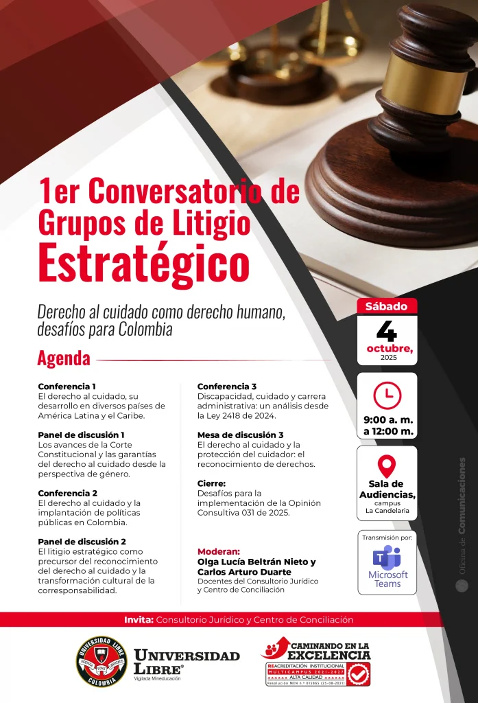 El sábado 4 de octubre, a las 9:00 a. m., se llevará a cabo en la Sala de Audiencias del campus La Candelaria el 1er Conversatorio de Grupos de Litigio Estratégico, bajo el tema Derecho al cuidado como derecho humano, desafíos para Colombia. El evento contará con transmisión vía Microsoft Teams.