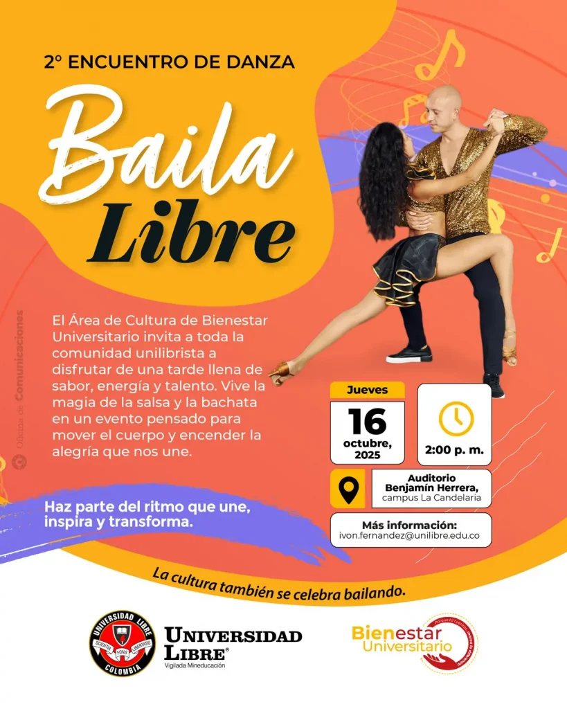El próximo jueves 16 de octubre de 2025, a partir de las 2:00 p. m., el auditorio Benjamín Herrera del campus La Candelaria será el escenario del 2° Encuentro de Danza Baila Libre, organizado por el Área de Cultura de Bienestar Universitario de la Universidad Libre.