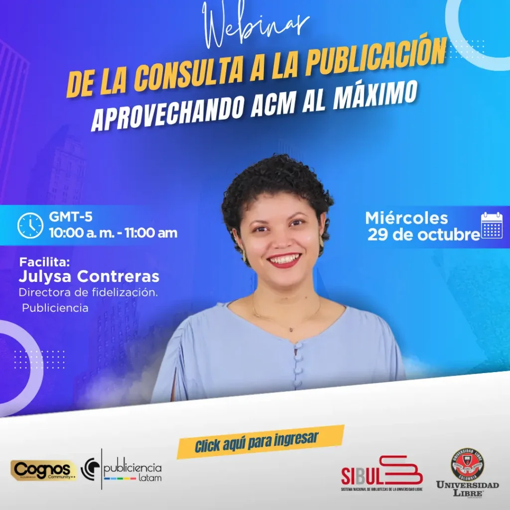 El Sistema Nacional de Bibliotecas de la Universidad Libre invita a toda la comunidad académica nacional a participar en la capacitación “De la consulta a la publicación: aprovechando ACM al máximo”, un espacio gratuito que se llevará a cabo el jueves 29 de octubre a las 10:00 a. m. a través de Microsoft Teams.