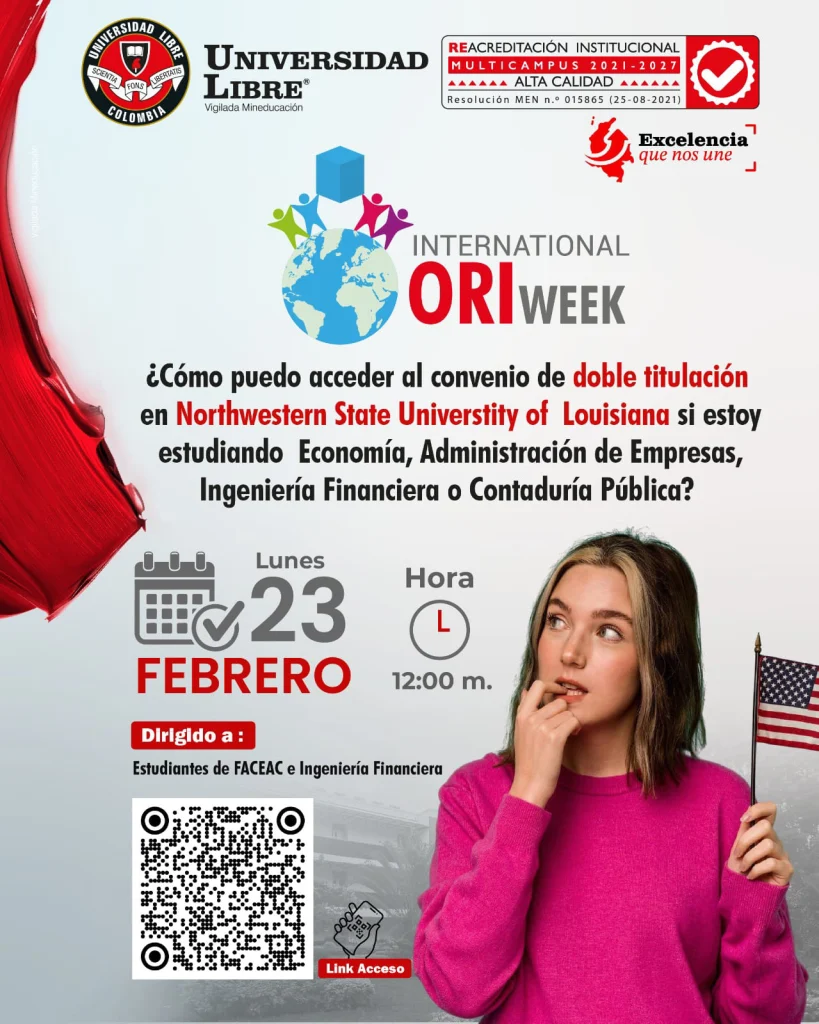 La Oficina de Relaciones Interinstitucionales invita a los estudiantes de los programas de Economía, Administración de Empresas, Ingeniería Financiera y Contaduría Pública a participar en la charla informativa sobre el proceso de acceso al convenio de doble titulación con la Northwestern State University of Louisiana (Estados Unidos).