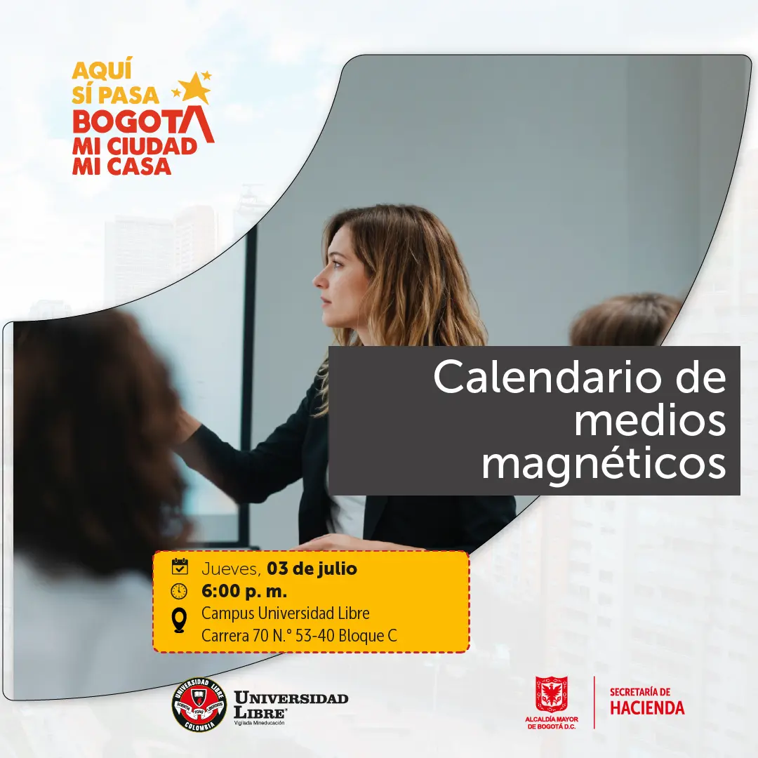 La Facultad de Ciencias Económicas, Administrativas y Contables de la Unilibre, en colaboración con la Secretaría de Hacienda de la Alcaldía Mayor de Bogotá, invita a la charla Calendario de Medios Magnéticos, que se llevará a cabo el jueves 3 de julio a las 6:00 p. m. en el campus El Bosque Popular.