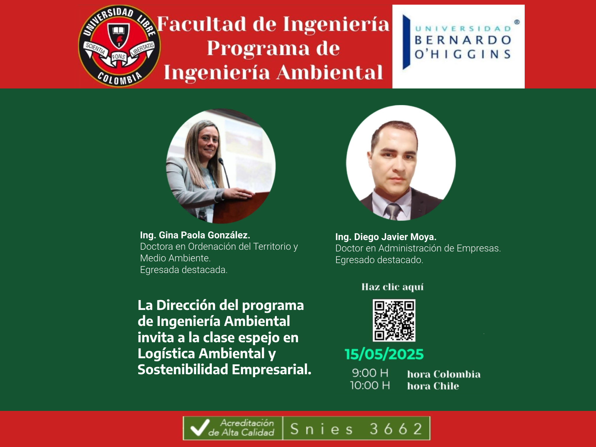 La Dirección del Programa de Ingeniería Ambiental de la Universidad Libre tiene el gusto de invitar a toda la comunidad académica a participar en las clases espejo sobre Logística Ambiental y Sostenibilidad Ambiental, desarrolladas en cooperación con la Universidad Bernardo O’Higgins de Chile.