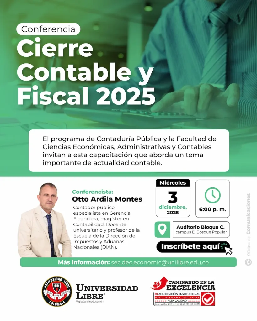 El próximo 3 de diciembre de 2025, a las 6:00 p. m., en el auditorio del Bloque C del campus El Bosque Popular, se realizará la conferencia Cierre Contable y Fiscal 2025, un espacio académico abierto a toda la comunidad interesada.