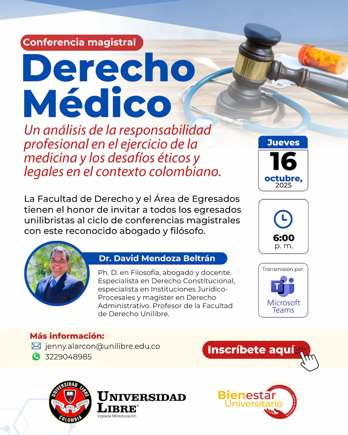 Este 16 de octubre, a las 6:00 p. m., se realizará la conferencia “Derecho Médico: un análisis de la responsabilidad profesional en el ejercicio de la medicina y los desafíos éticos y legales en el contexto colombiano”, dirigida a los egresados unilibristas. La actividad será vía Microsoft Teams.