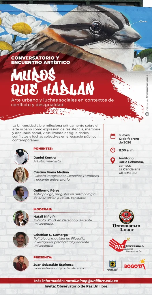 El jueves 12 de febrero de 2026, a las 11:00 a. m., en el auditorio Darío Echandía del campus La Candelaria, se realizará el Conversatorio y encuentro artístico “Muros que hablan: arte urbano y luchas sociales en contextos de conflicto y desigualdad”.