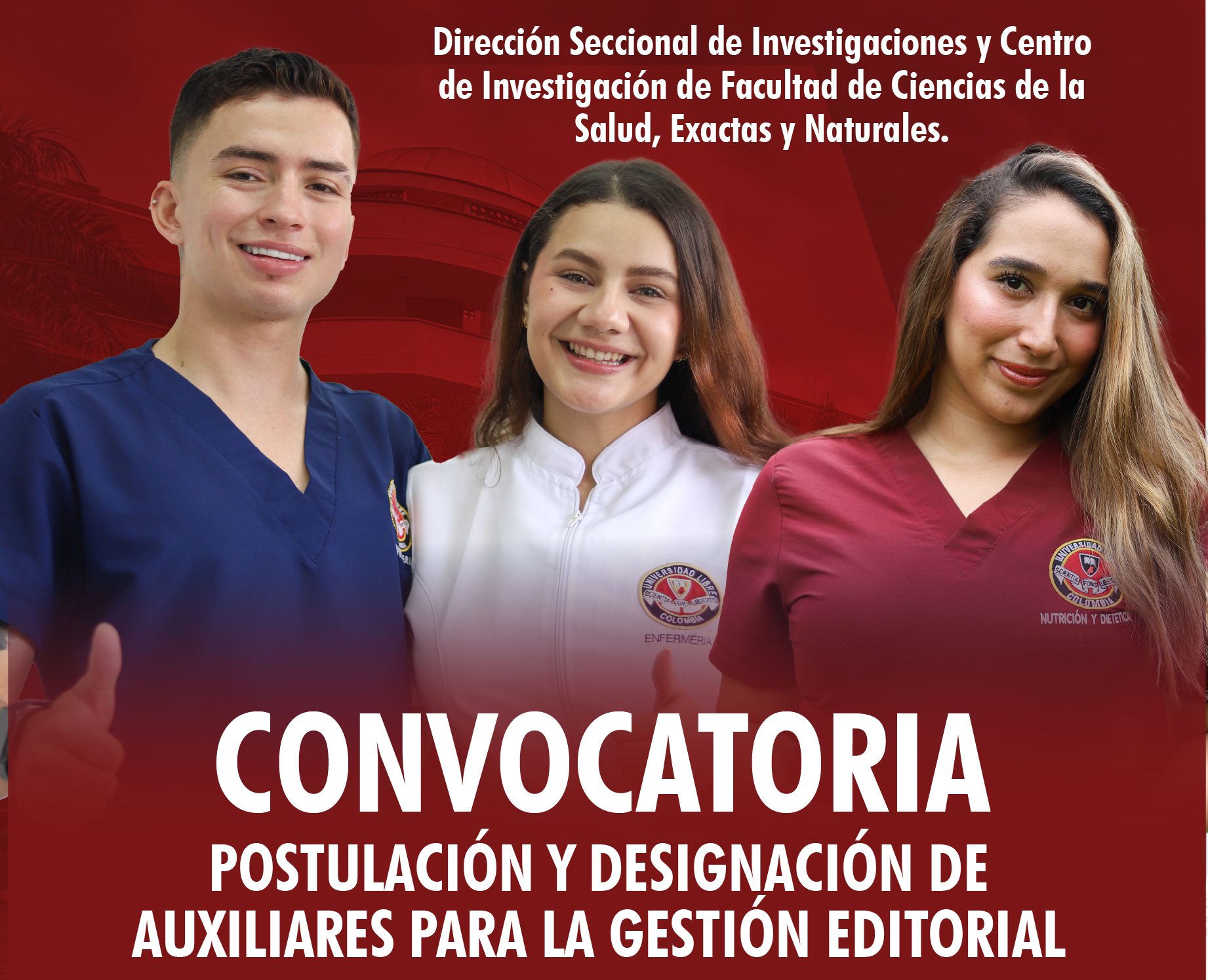 La Universidad Libre, a través de la Dirección Seccional de Investigaciones y el Centro de Investigaciones de la Facultad de Ciencias de la Salud, Exactas y Naturales, abre la convocatoria interna No. 562501 para la postulación y designación de auxiliares para la gestión editorial, dirigida a estudiantes de pregrado que deseen fortalecer sus competencias en el ámbito editorial y de investigación científica.