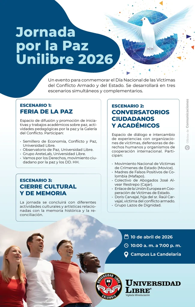 La Universidad Libre, comprometida con la construcción de paz y la memoria histórica de Colombia, invita a la Feria de la Paz que se realizará el viernes, 10 de abril de 2026, de 10:00 a. m. a 7:00 p. m., frente al auditorio Benjamín Herrera. Un espacio de encuentro, reflexión y expresión colectiva.