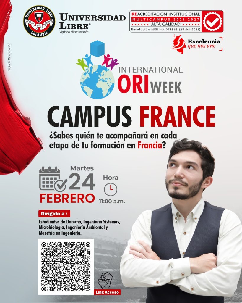 La Oficina de Relaciones Interinstitucionales (ORI) invita a la comunidad estudiantil a participar en la charla informativa “Campus France”, un espacio diseñado para orientar, paso a paso, a quienes desean construir un proyecto académico en Francia y conocer el acompañamiento institucional disponible en cada fase del proceso.