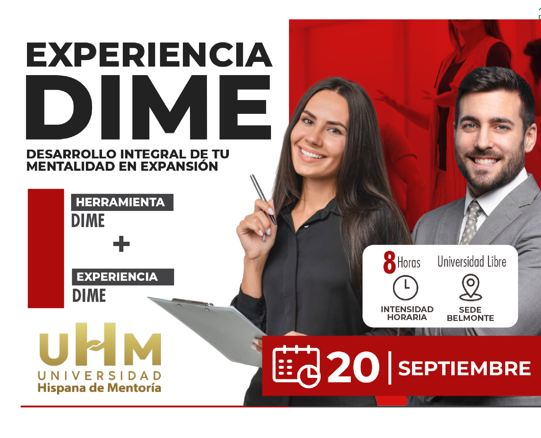 La Universidad Libre Seccional Pereira, en alianza con la Universidad Hispana de Mentoría, te invita a vivir la Experiencia DIME: un programa de 8 horas diseñado para potenciar tu mentalidad, fortalecer el liderazgo, mejorar la productividad y promover el bienestar laboral sostenible.