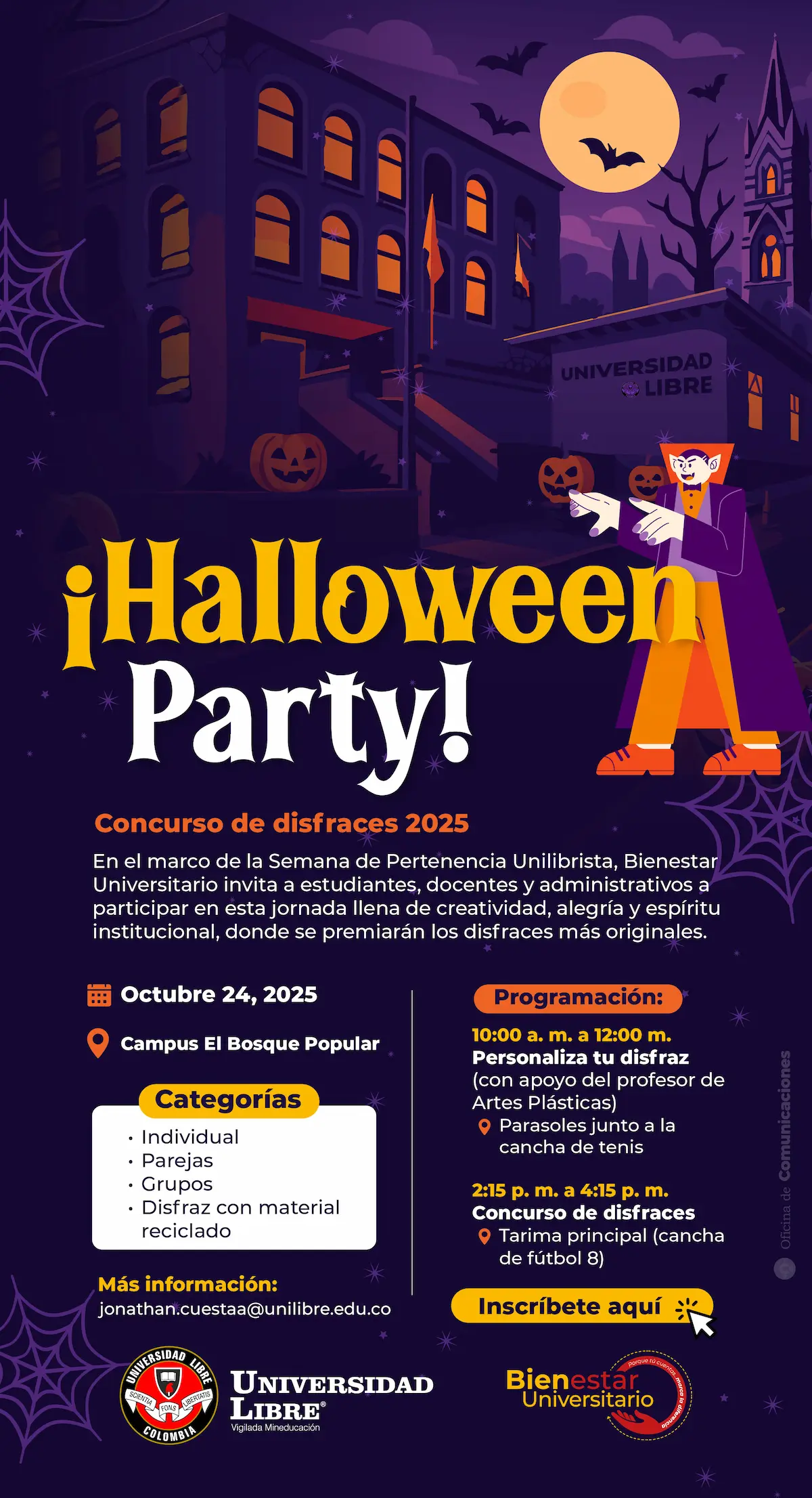 El próximo 24 de octubre de 2025, en el campus El Bosque Popular, la Unilibre vivirá una divertida jornada con la Halloween Party, evento organizado por Bienestar Universitario en el marco de la Semana de Pertenencia Unilibrista, que busca fortalecer el sentido de identidad y unión entre estudiantes, docentes y administrativos.