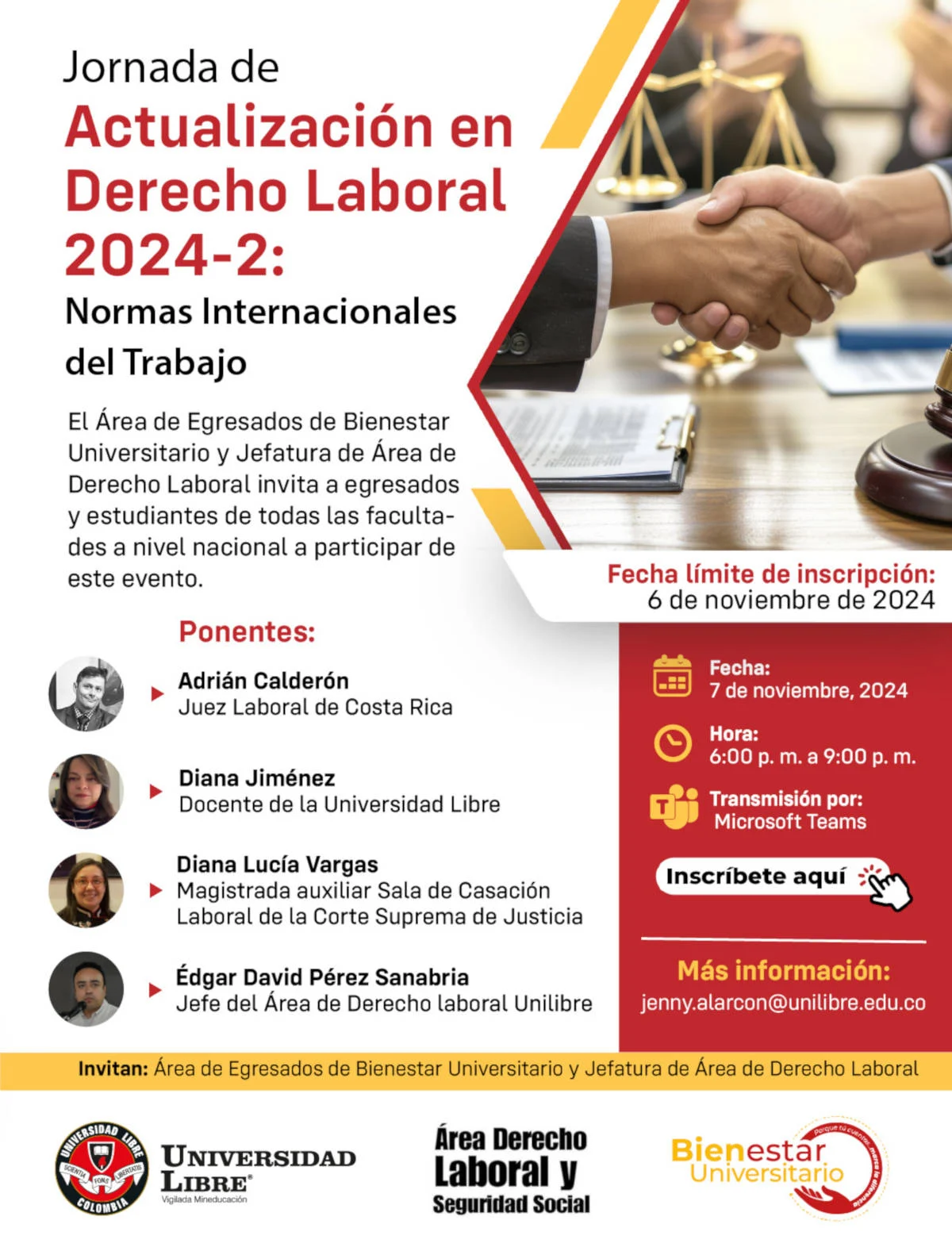 Se invita a egresados y estudiantes Unilibristas a nivel nacional a participar en la Jornada de Actualización en Derecho Laboral 2024-2, que se llevará a cabo el 7 de noviembre de 2024, de 6:00 p. m. a 9:00 p. m., a través de Microsoft Teams.