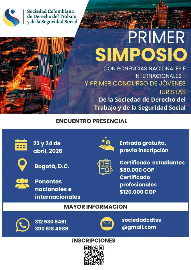 Los días 23 y 24 de abril de 2026 se llevará a cabo, el Primer Simposio con ponencias nacionales e internacionales y Primer Concurso de Jóvenes Juristas, organizado por la Sociedad Colombiana de Derecho del Trabajo y de la Seguridad Social, en un encuentro presencial que reunirá a expertos y nuevas generaciones del ámbito jurídico.
