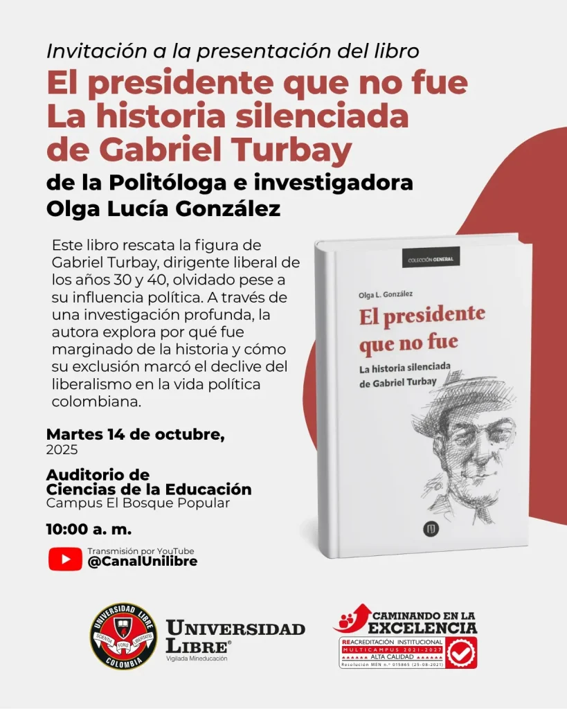 La Universidad Libre invita a la presentación del libro El presidente que no fue: La Historia silenciada de Gabriel Turbay. Autora: Olga Lucía González, politóloga e investigadora este martes 14 de octubre a partir de las 10:00 a.m. en el Auditorio de Ciencias de la Educación de El Bosque Popular.