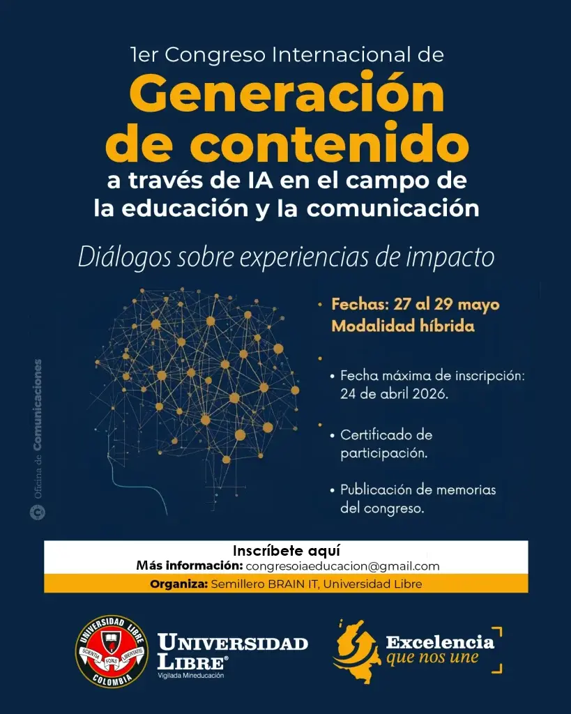 Del 27 al 29 de mayo de 2026, la Unilibre llevará a cabo el 1er Congreso Internacional de Generación de contenido a través de inteligencia artificial en el campo de la educación y la comunicación, un espacio académico que se desarrollará en modalidad híbrida y reunirá experiencias de impacto.