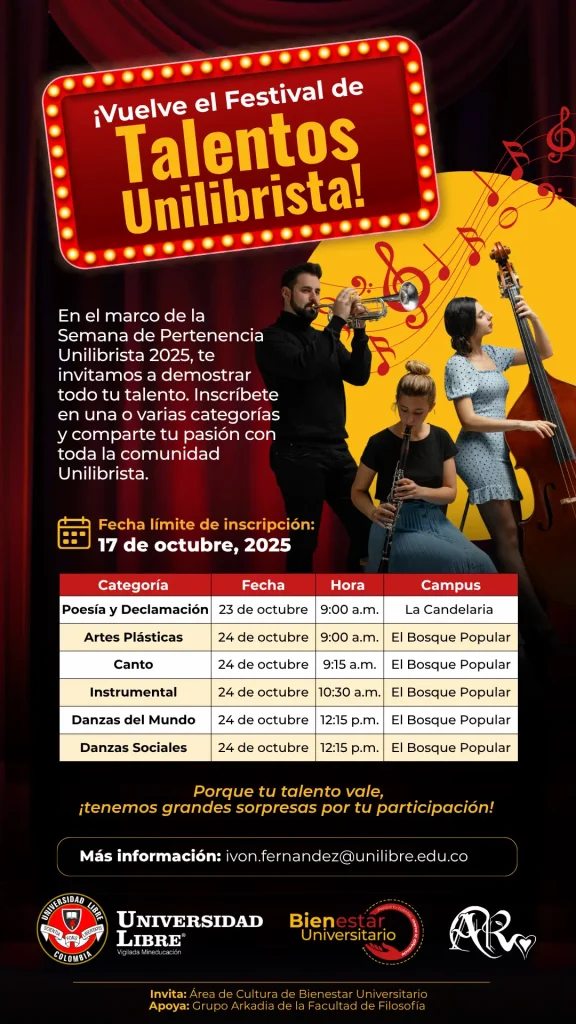 Invita el Área de Cultura de Bienestar Universitario. Para mayor información, los interesados pueden comunicarse con Ivon Fernández al correo ivon.fernandez@unilibre.edu.co.