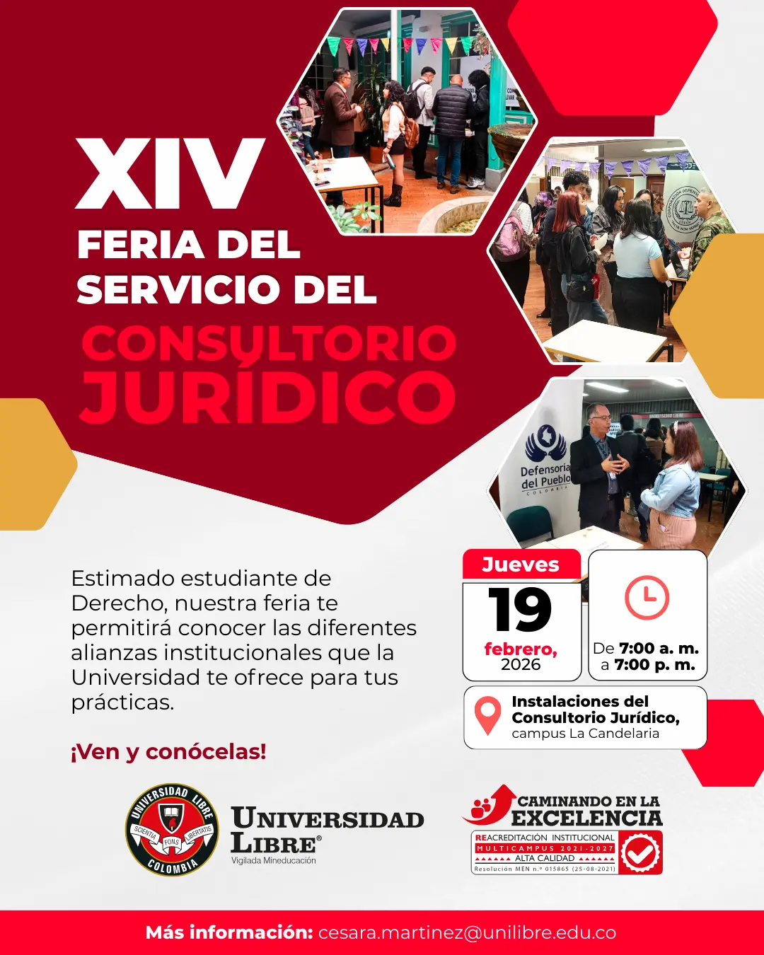Los estudiantes unilibristas de Derecho están invitados a participar en la XIV Feria del Servicio del Consultorio Jurídico, que se realizará el 19 de febrero de 2026, de 7:00 a. m. a 7:00 p. m., en las instalaciones del Consultorio Jurídico del campus La Candelaria.