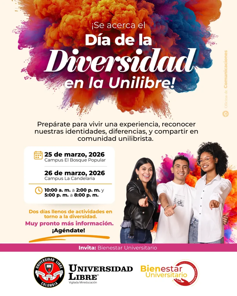La Universidad Libre vivirá, este 25 y 26 de marzo de 2026, una nueva edición del Día de la Diversidad Unilibrista, una iniciativa liderada por Bienestar Universitario que se desarrollará en el Campus El Bosque Popular y el Campus La Candelaria, respectivamente.