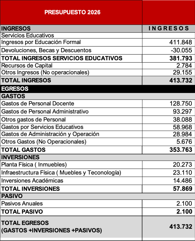 Artículo 1. Aprobar el presupuesto anual de ingresos y gastos por programas, proyectos y actividades de la Universidad Libre, consolidado con los de las Seccionales, Autoridades Nacionales y el Colegio de la Universidad, para el año comprendido entre el 1 de enero y el 31 de diciembre de 2026, por la suma de CUATROCIENTOS TRECE MIL SETECIENTOS TREINTA Y DOS MILLONES DE PESOS ($413.732.000.000.00), en los siguientes términos: