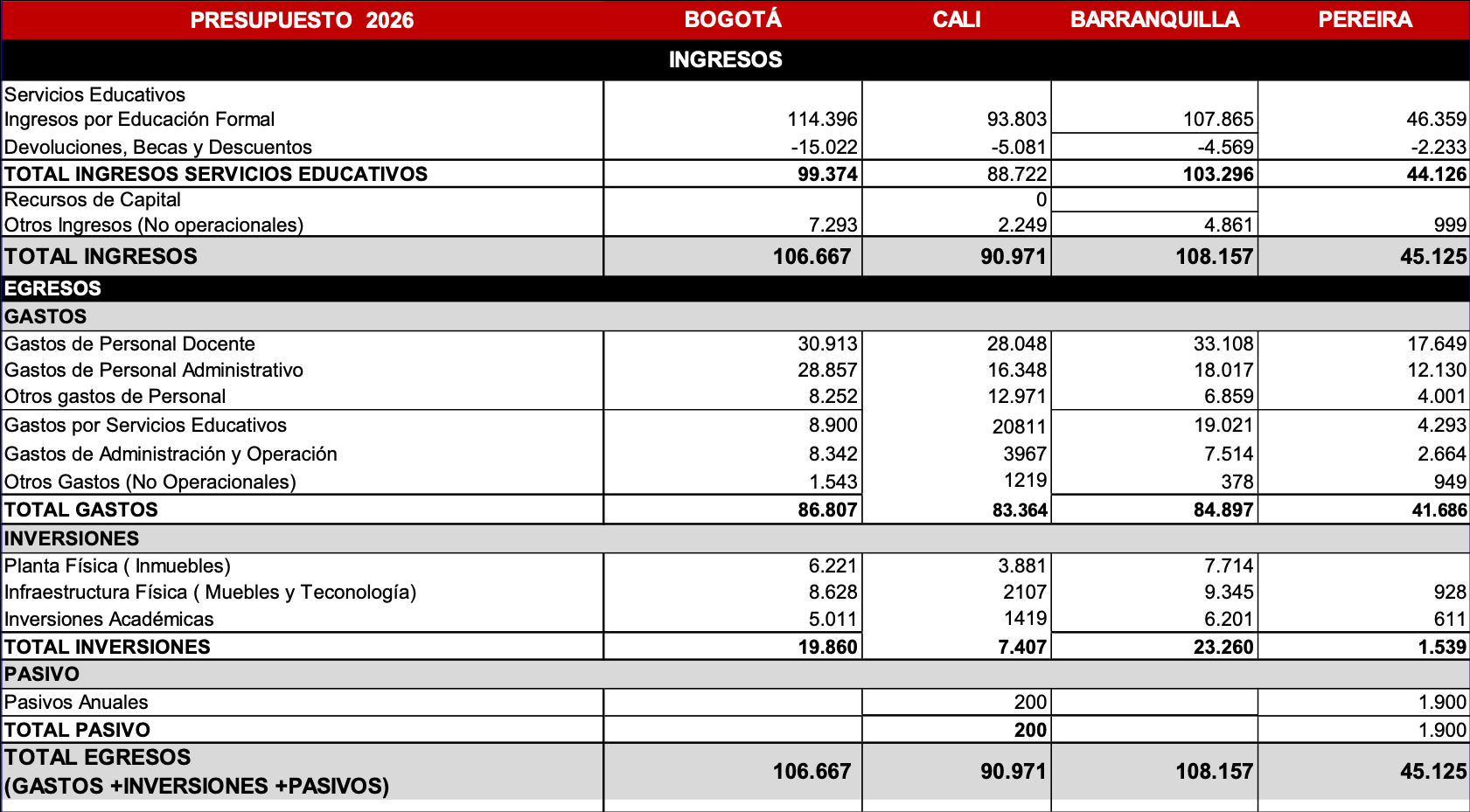 Artículo 2. El presupuesto aprobado para las seccionales de Bogotá, Cali, Barranquilla y Pereira, se detalla de la siguiente manera: