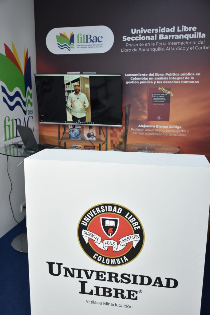 La Universidad Libre Seccional Barranquilla, a través de su Sello Editorial, participó activamente en la Feria Internacional del Libro de Barranquilla, el Atlántico y el Caribe – FILBAC 2025, donde hizo presencia con su stand institucional entre el 5 y el 9 de noviembre, ofreciendo al público su producción académica y científica. En este marco, el sábado 8 de noviembre a las 7:00 p. m. se realizó la presentación del libro Política pública en Colombia: un análisis integral de la gobernanza y los derechos humanos, de la autoría del profesor Alejandro Blanco Zúñiga, docente e investigador del programa de Derecho. La actividad reunió a estudiantes, académicos, representantes de organizaciones sociales y visitantes de la feria, quienes acompañaron el lanzamiento y dialogaron sobre los desafíos actuales de la política pública en el país.