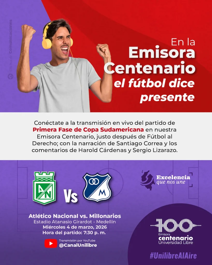 La emoción del fútbol llega a la Emisora Centenario de la Universidad Libre, que transmitirá en vivo el partido correspondiente a la Primera Fase de la Copa Sudamericana entre Atlético Nacional y Millonarios.