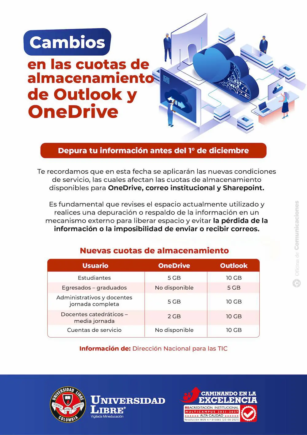 Reiteramos a nuestra comunidad universitaria que superar las cuotas asignadas puede ocasionar fallas en los servicios, pérdida definitiva de información y afectaciones asociadas a Office 365, si no se toman las acciones de limpieza o respaldo correspondientes.