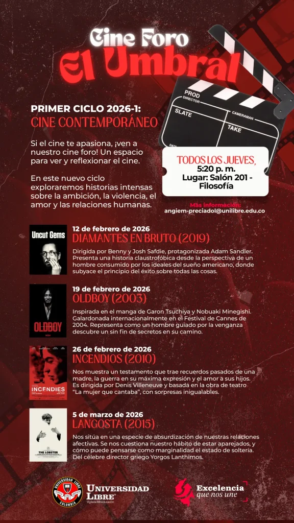 El cine foro El Umbral, espacio liderado por estudiantes de la Facultad de Filosofía de la Unilibre, presenta su primer ciclo de 2026-1: cine contemporáneo. Este espacio se desarrollará todos los jueves a las 5:20 p. m., en el salón 201 de Filosofía, del campus La Candelaria.