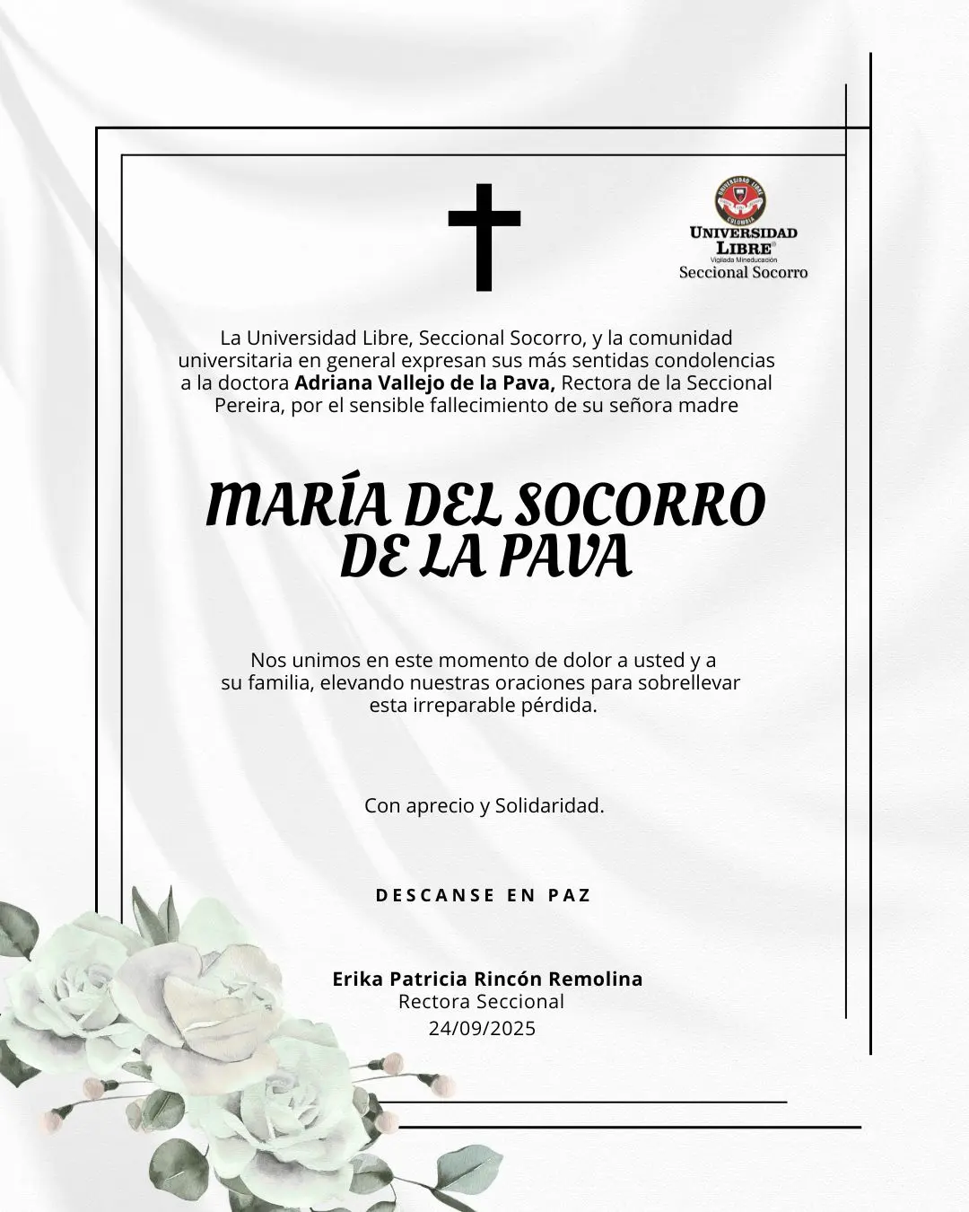 🕊️ La Universidad Libre, Seccional Socorro, se une al dolor de la doctora Adriana Vallejo de la Pava, rectora de la Seccional Pereira, por el sensible fallecimiento de su señora madre María del Socorro de la Pava.