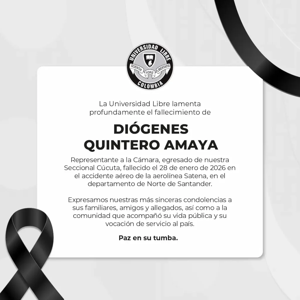 La Universidad Libre lamenta profundamente el fallecimiento del señor Diógenes Quintero Amaya, representante a la Cámara, egresado de nuestra Seccional Cúcuta, fallecido el 28 de enero de 2026 en el accidente aéreo de la aerolínea Satena, en el departamento de Norte de Santander.