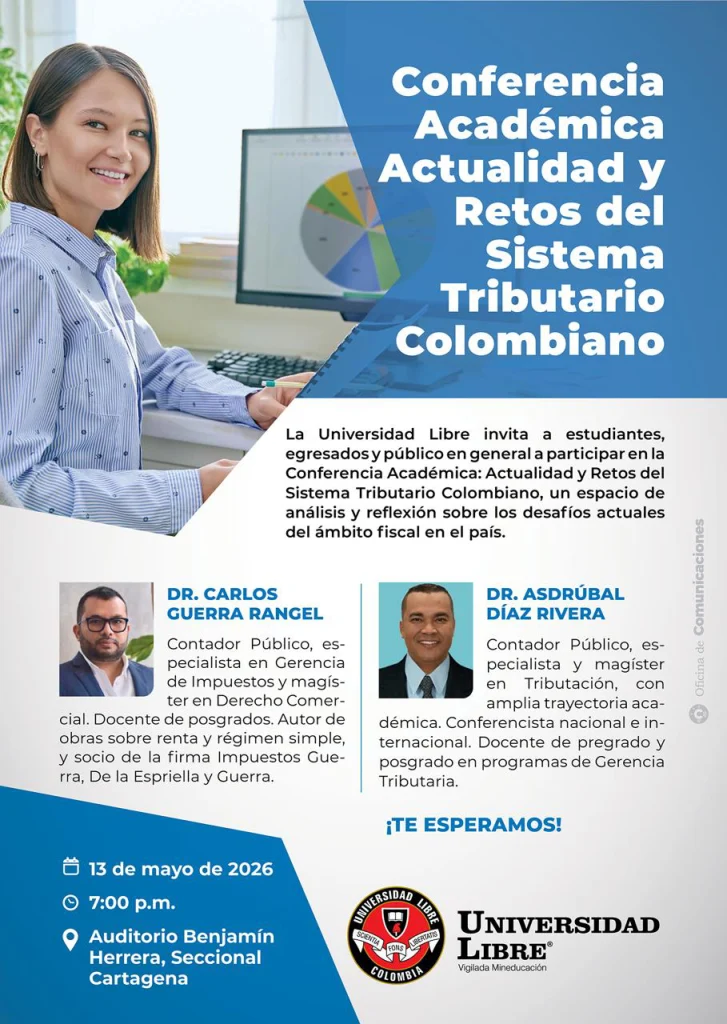 La Universidad Libre invita a estudiantes, egresados y público en general a participar en la Conferencia Académica: Actualidad y Retos del Sistema Tributario Colombiano, un espacio de análisis y reflexión sobre los desafíos actuales del ámbito fiscal en el país.