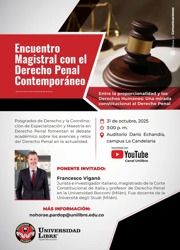 El próximo 31 de octubre de 2025, a las 3:00 p. m., se llevará a cabo en el auditorio Darío Echandía, del campus La Candelaria, el ‘Magistral Encuentro con el Derecho Penal Contemporáneo: Entre la proporcionalidad y los Derechos Humanos, una mirada constitucional al Derecho Penal’.