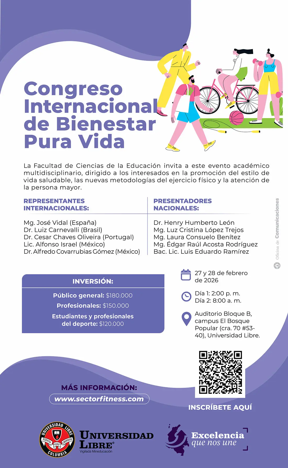 Se invita a la comunidad académica y al público interesado a participar en el Congreso Internacional de Bienestar “Pura Vida”, que se llevará a cabo los días 27 y 28 de febrero de 2026 en el auditorio Bloque B del campus El Bosque Popular de la Unilibre.