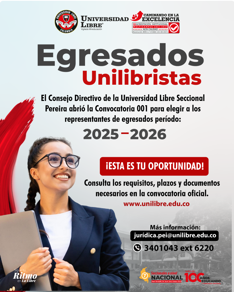 La Universidad Libre Seccional Pereira invita a todos sus egresados a participar en la Convocatoria 001, mediante la cual se seleccionarán los representantes ante el Consejo Directivo para el período 2025–2026.