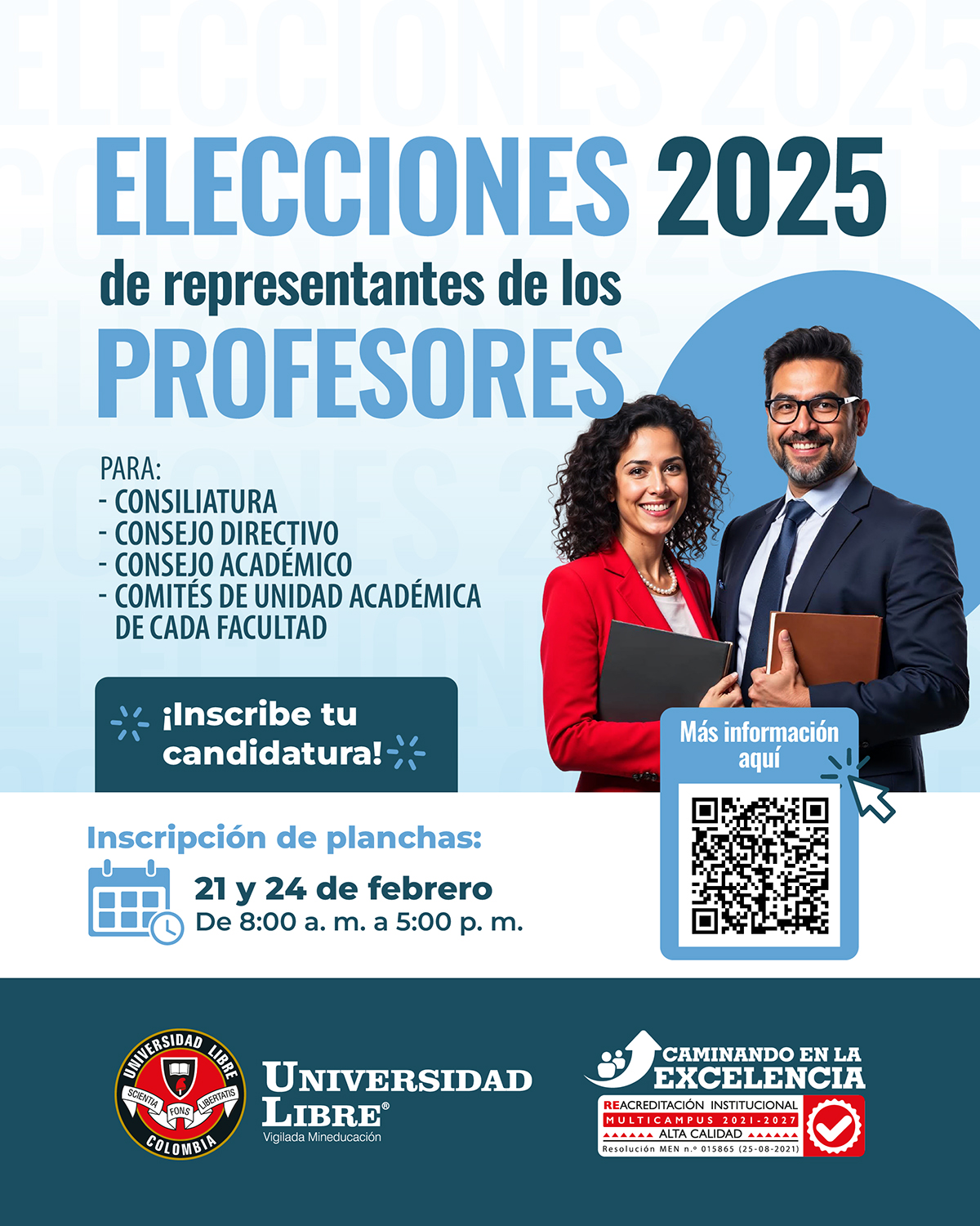La Universidad Libre convoca a los Profesores de la seccional Cúcuta para que participen en la elección al Consejo Directivo, Consejo Académico y Comités de Unidad Académica, que se llevará a cabo el día 12 de marzo de 2025 entre las 8:00 y las 20:00 horas.