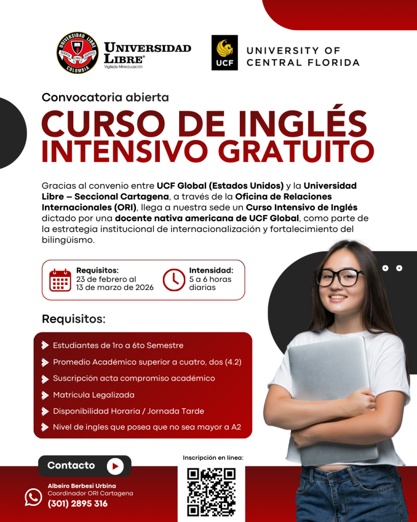 En el marco del convenio suscrito entre la Universidad de Central Florida – UCF Global (Orlando, Florida, Estados Unidos de América) y la Universidad Libre – Seccional Cartagena, y como manifestación de nuestra función misional de internacionalización y del impacto institucional orientado al fortalecimiento del bilingüismo, se impartirá un Curso Intensivo de Inglés en nuestras instalaciones. Este curso estará a cargo de una docente estadounidense de UCF Global, tendrá una duración corta y se desarrollará entre el 23 de febrero de 2026 y el 13 de marzo de 2026, con una intensidad aproximada de 5 a 6 horas diarias.