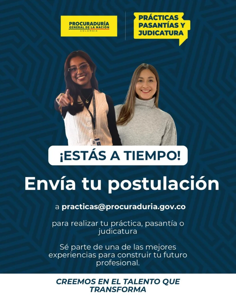 La Procuraduría General de la Nación de Colombia extiende una cordial invitación a estudiantes y profesionales interesados en desarrollar su carrera a través de programas de prácticas, pasantías y judicatura. Esta es una excelente oportunidad para adquirir experiencia en el ámbito público y fortalecer tus competencias profesionales, contribuyendo al bienestar de la sociedad.