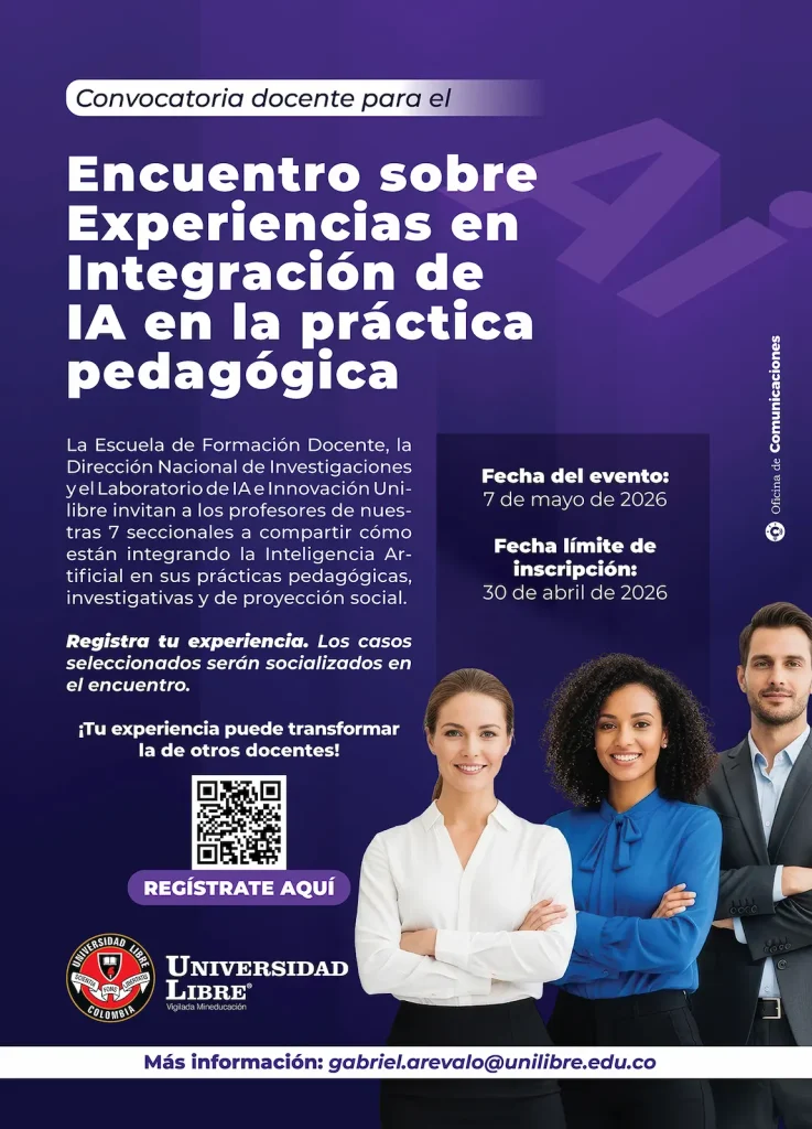El próximo 7 de mayo de 2026 se llevará a cabo el Encuentro sobre Experiencias en Integración de IA en la práctica pedagógica, una iniciativa de la Escuela de Formación Docente, la Dirección Nacional de Investigaciones y el Laboratorio de IA e Innovación Unilibre, que convoca a los profesores de las siete seccionales de la Universidad Libre a participar activamente con sus experiencias.