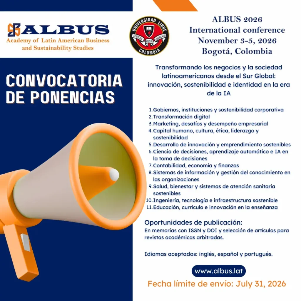 Se invita a docentes, investigadores, estudiantes y comunidad académica en general a participar en la Convocatoria de Ponencias para la Conferencia Internacional ALBUS 2026 (Academy of Latin American Business and Sustainability Studies), que se realizará del 3 al 5 de noviembre de 2026 en Bogotá.