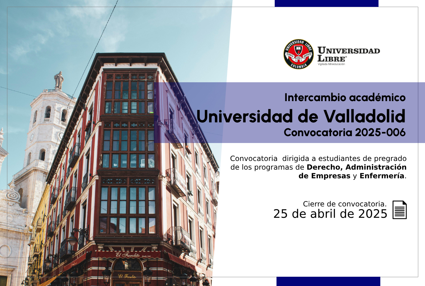 La Universidad Libre invita a sus estudiantes a participar en la Convocatoria N°2025-006 para el Programa de Intercambio Académico con la Universidad de Valladolid, en España. Este programa ofrece la oportunidad de cursar un semestre en una universidad anfitriona, gracias a los convenios de intercambio académico suscritos por la institución.
