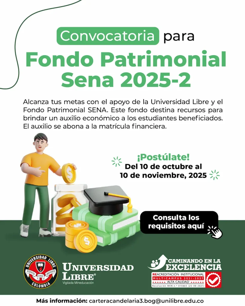 ¿Eres estudiante de pregrado de la Universidad Libre Seccional Bogotá? ¡Puedes acceder al Fondo Patrimonial del SENA, un apoyo económico correspondiente a un porcentaje del valor de tu matrícula!