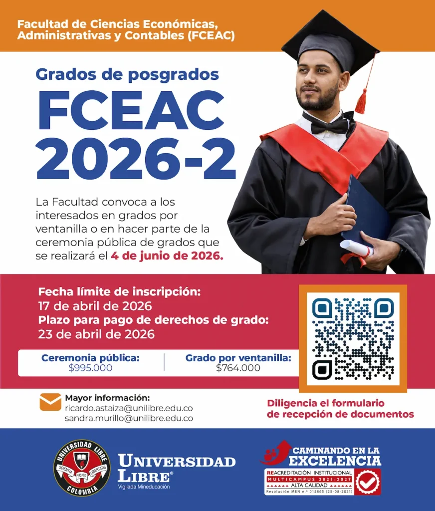Se invita a los estudiantes de posgrados de la Facultad de Ciencias Económicas, Administrativas y Contables (FCEAC), que ya cumplieron con los requisitos para graduarse, a realizar la correspondiente inscripción, ya sea para grados por ventanilla o en la ceremonia pública, programada para el 4 de junio de 2026.