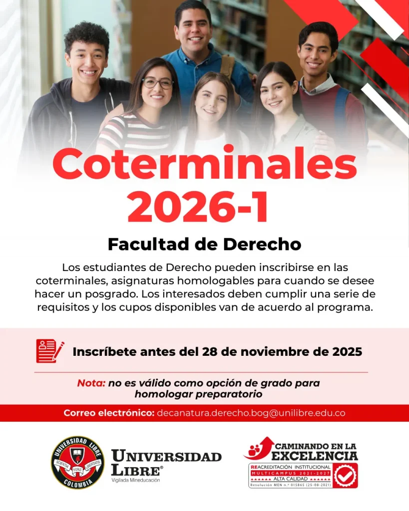 Los estudiantes de la Facultad de Derecho tienen la posibilidad de inscribirse en las coterminales, asignaturas homologables para cuando se desee hacer un posgrado. Los interesados deben cumplir con una serie de requisitos y los cupos disponibles van de acuerdo al programa.