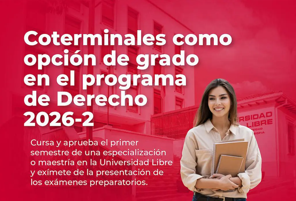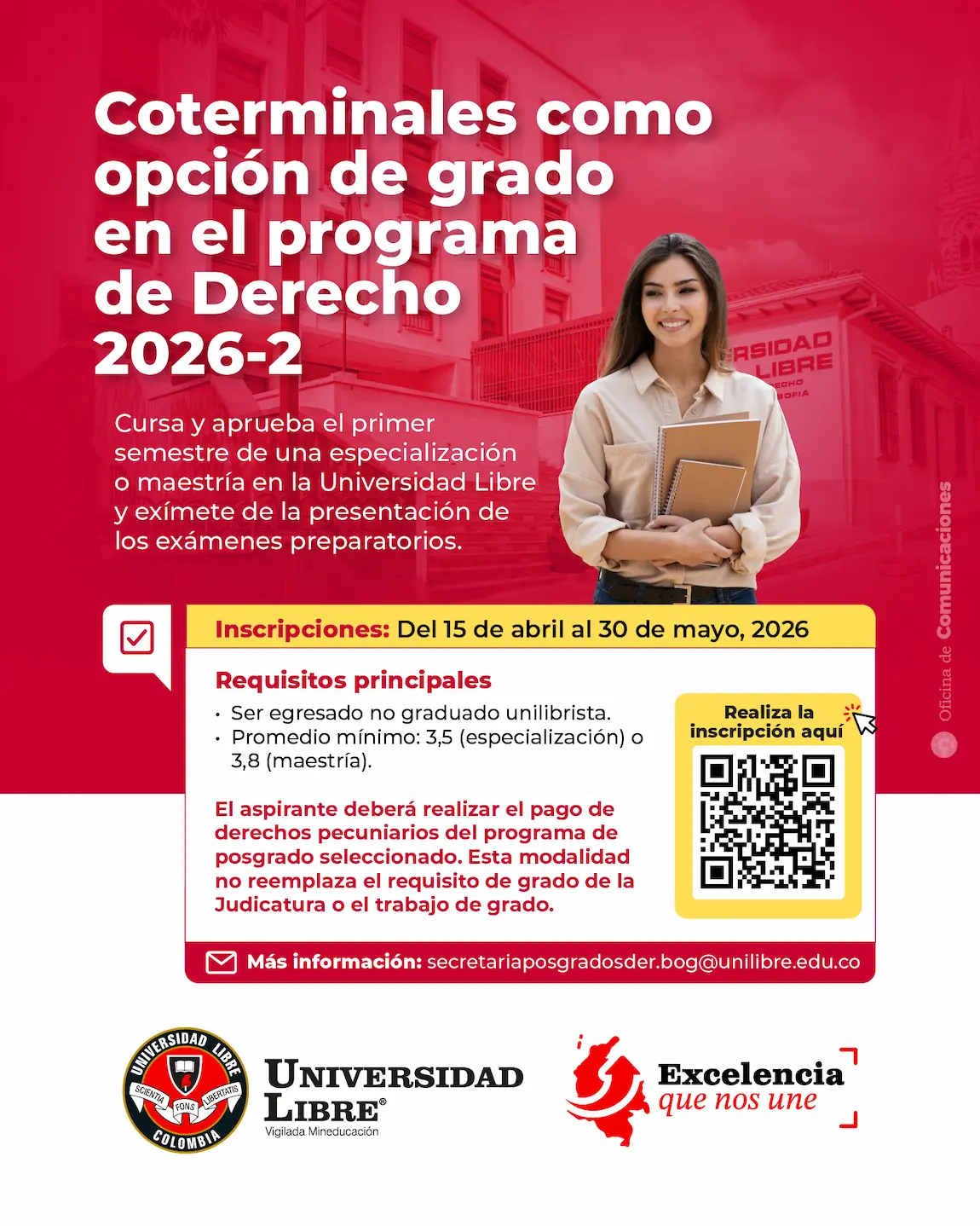 La Universidad Libre abre inscripciones para la modalidad de coterminales en el programa de Derecho correspondiente al periodo 2026-2, una opción académica que permite a estudiantes egresados no graduados avanzar en su formación posgradual mientras culminan su proceso de grado.