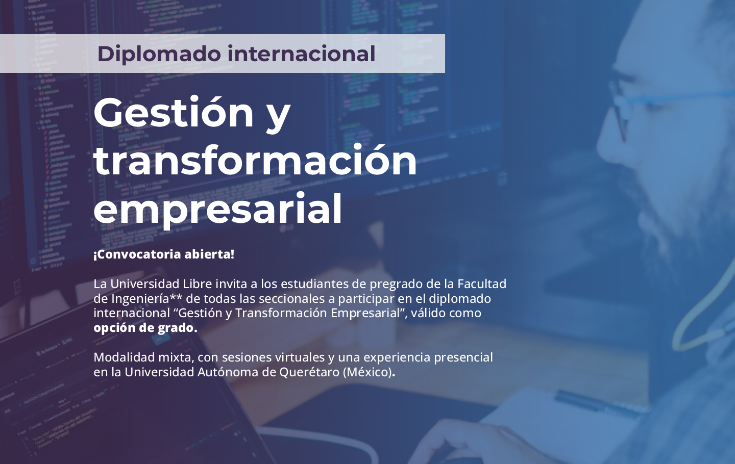 La Universidad Libre, en alianza con la Universidad Autónoma de Querétaro (UAQ), invita a los estudiantes de los programas de pregrado en Ingeniería Mecánica —con excepción de Ingeniería de Sistemas— de todas las seccionales, a participar en el Diplomado Internacional “Gestión y Transformación Empresarial”, válido como opción de grado.