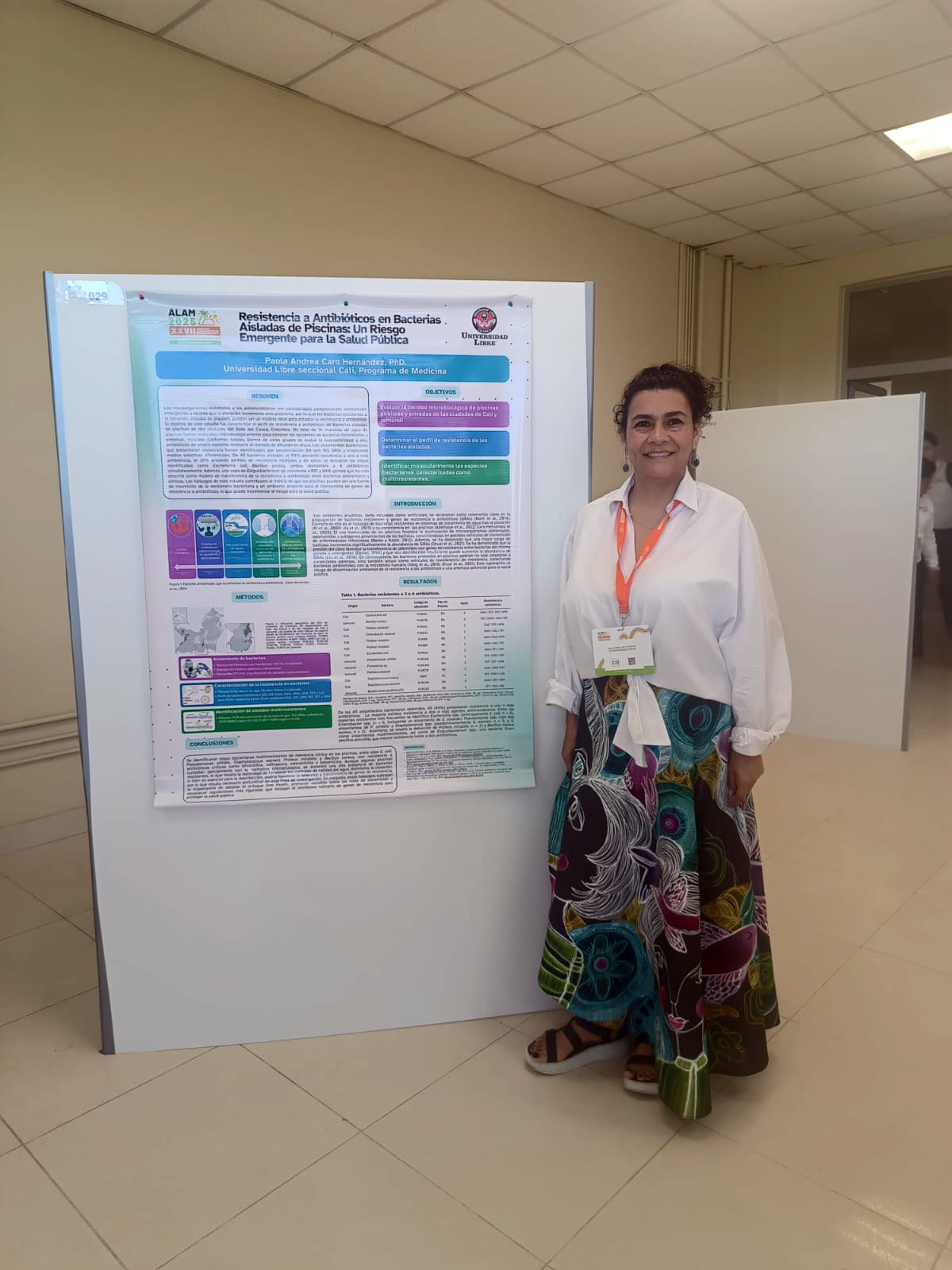 En el marco del ALAM 2025, la docente presentó el póster “Resistencia a antibióticos en bacterias aisladas de piscinas: un riesgo emergente para la salud pública”, trabajo derivado del proyecto que lidera en el Programa de Medicina.