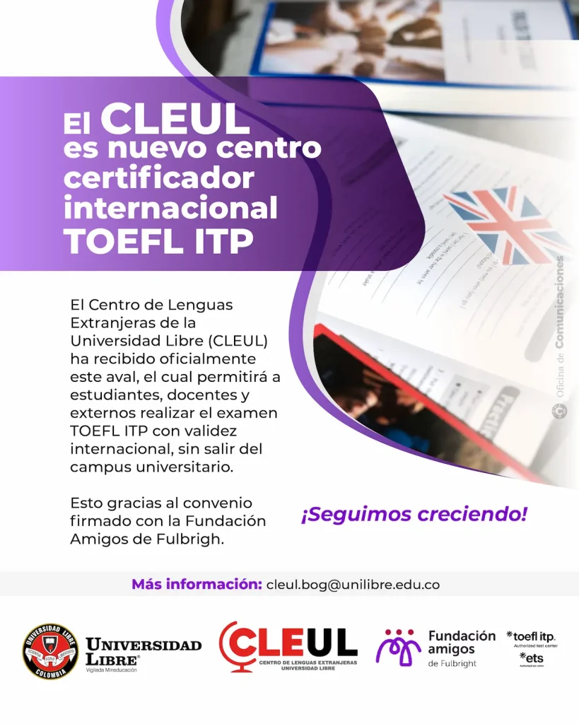 El Centro de Lenguas Extranjeras de la Universidad Libre – CLEUL ha sido reconocido como centro certificador TOEFL gracias al convenio con Amigos Fulbright. Invitamos a todos los interesados en certificar su nivel de inglés a nivel internacional presentar la prueba como parte de esta gran alianza.