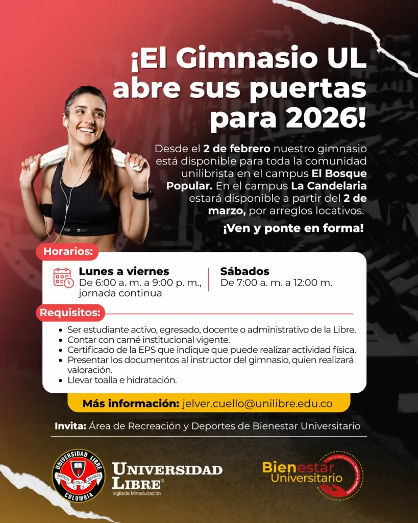 La Universidad Libre informa a toda la comunidad unilibrista que, desde el 2 de febrero de 2026, el Gimnasio UL ya se encuentra disponible en el campus El Bosque Popular, como parte de la oferta de bienestar y vida saludable para estudiantes, egresados, docentes y administrativos.